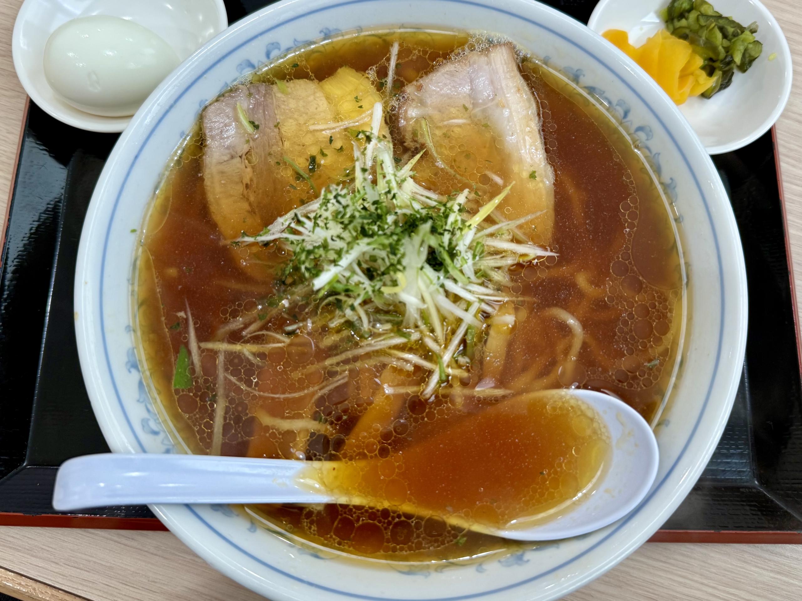 審査員: 漬物とライス150円が食べ放題30円現金投入でゆで卵。コシの強い麺に濃いめの醤油スープ。味とコスパ抜群。
