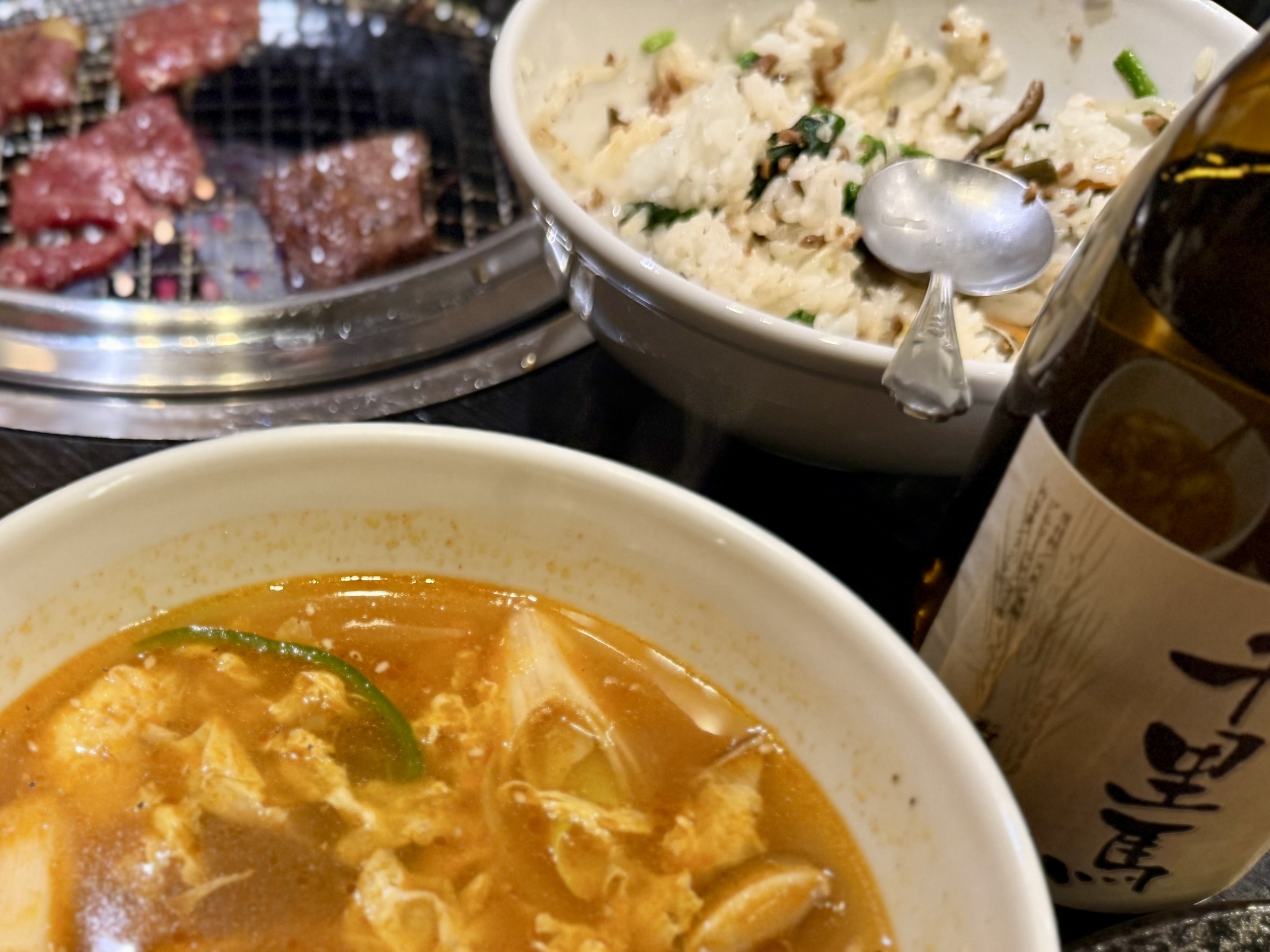 審査員: 麦焼酎ロゴ入りボトルに上タン塩と山形牛厚切りカイノミ。疲れも吹き飛ぶ1杯目の王道カルビスープを注文。
