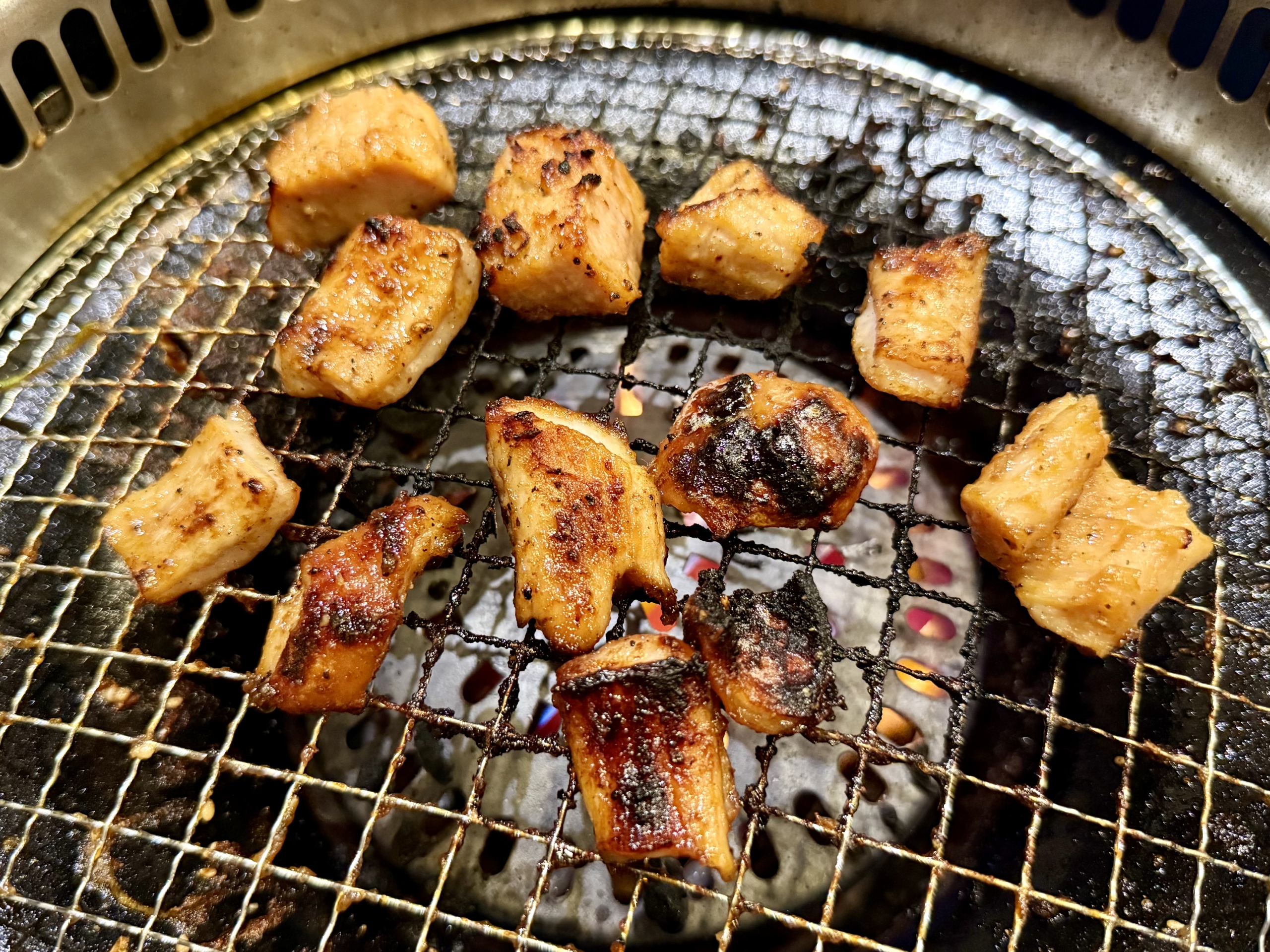 審査員: 噛むたび漏れ出すホルモン脂とタレの最強コンビ。こんだけ焼いても飲み込めない、2杯目カルビスープは断念。