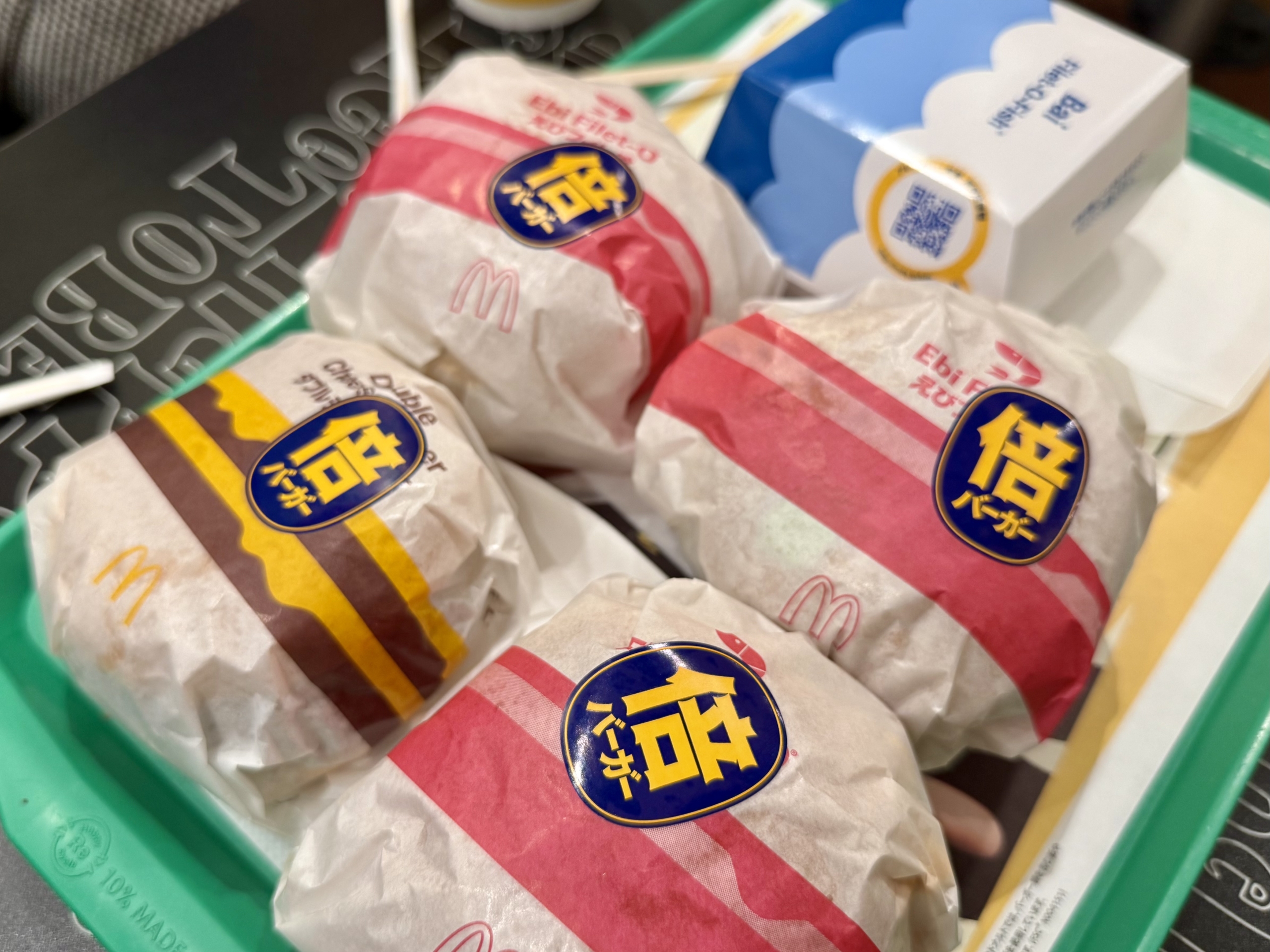 審査員: プリプリのえびカツが2枚倍えびフィレオが人気だが、夜マックはバ~イのバ~イのでパティ4枚をガッツリ。
