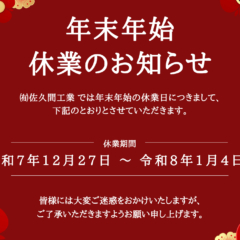 - 2025/12/08 年末年始休業のおしらせ 下記の期間を年末年始休業とさせていただきます。 休業期間:2025年12月27日(土)~2026年1月4日 ご不便をおかけいたし... 続きを読む