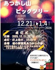 - 2024/12/20 あつかし山ビッグツリー あつかし山ビッグツリーの開催に向けて今年もイルミネーションの設営を行いました。 12月22日の点灯式では、打ち上げ花火とイルミネ... 続きを読む